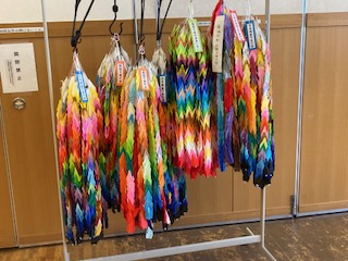 広島平和ツアー企画に伴い、全損保取組みに連帯して折り鶴の取組みを展開しました。職場単位会を中心に9条の会会員等に呼びかけ、7月末までに415名から9,730羽の折り鶴を集約することができました。折り鶴を寄せていただいた方からは、被爆80周年に込めた平和への願い、「ロシア・ウクライナ戦争やイスラエルによるパレスチナ・ガザ攻撃を直ちに止めてほしい」「紛争を戦争にしない国際的な外交と対話の枠組み構築を」といった声が届けられました。また、「私も広島へ連れてってください」という折り鶴に託した思いも寄せられました。折り鶴は、糸通し・束ね作業を行って幾つかの連にし、8月6日朝の全損保慰霊碑に捧げました。