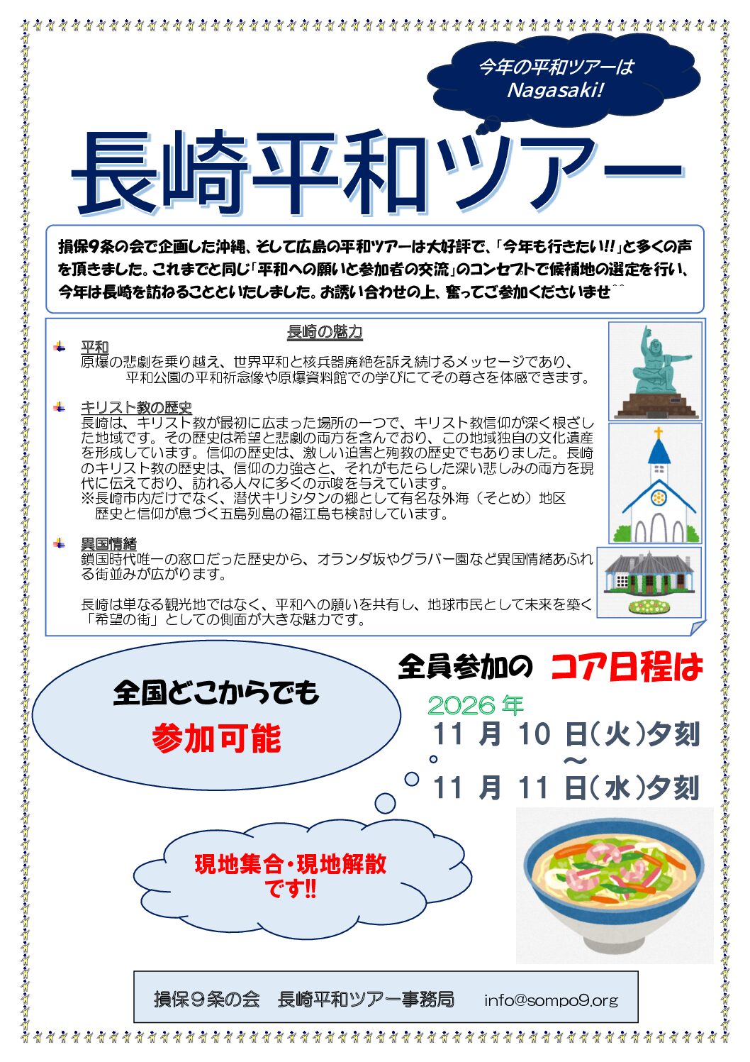 損保9条の会は今年も、憲法9条を守り戦争のない平和で豊かな日本と世界をつくるため元気に活動してまいります。秋の企画として「長崎平和ツアー」を計画、長崎市平和公園・原爆資料館訪問等世界平和と核兵器廃絶への思いを共有するとともに、異国情緒豊かな街並みが続く長崎市を散策、キリスト教の歴史と信仰が息づく外海(そとめ)や福江島を訪れることを検討しています。11月10日(火)夕方から11日(水)夕方までをコア日程とし参加者一同で行動、その前後は各自お好みの旅程を楽しむことができます。参加ご希望の方は損保9条の会事務局(info@sompo9.org)へお申し込みください。